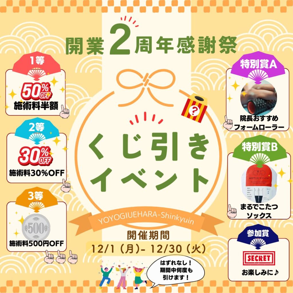 こんにちは!代々木上原鍼灸院の院長成石です。 2023年12月にオープンした代々木上原鍼灸院は、皆さまのおかげで今年12月に開院2周年を迎えます! 日々通ってくださる患者さま、ご紹介で素敵なご縁を結んでくださった皆さまに、心より感謝申し上げます。本...